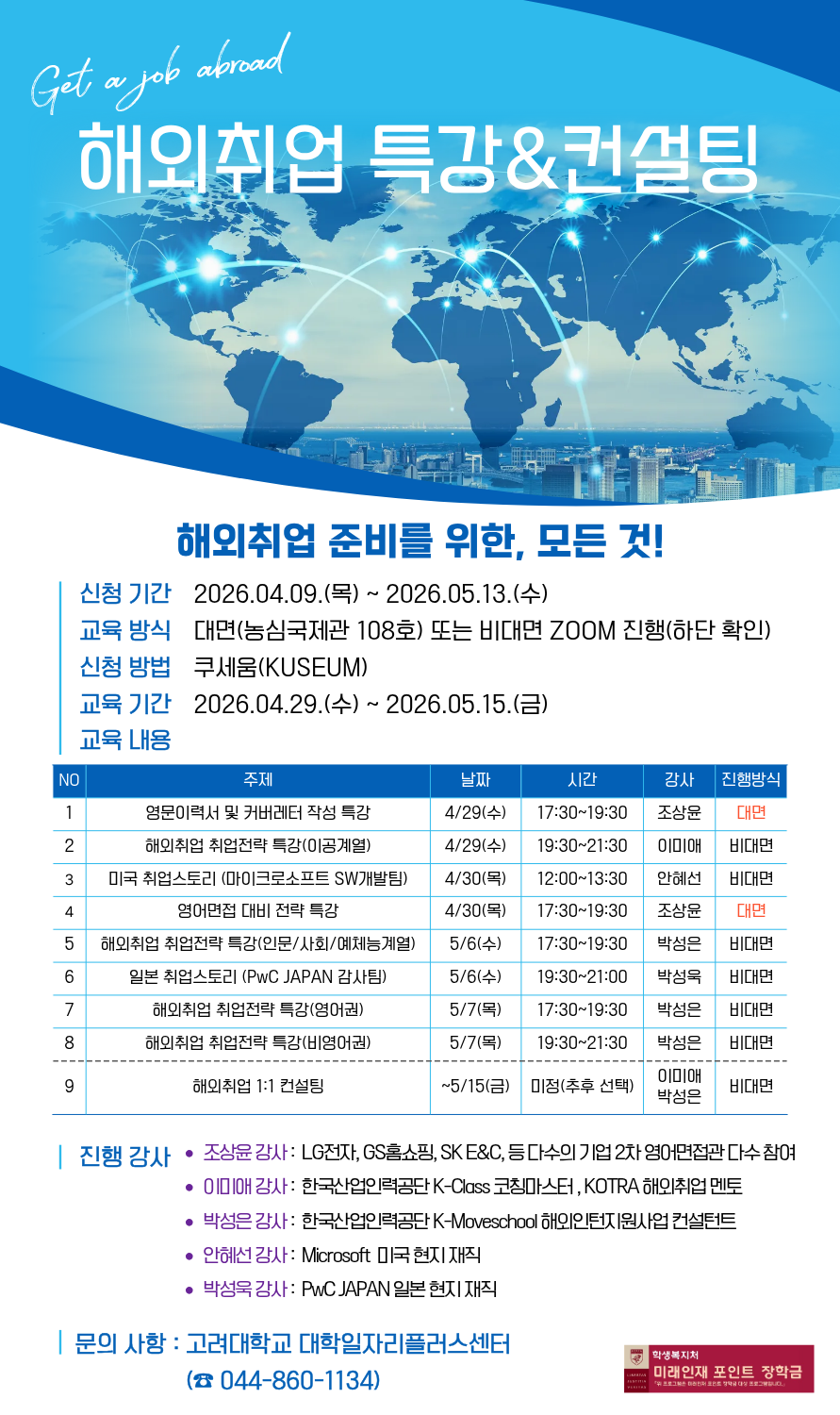 | 8 | 2026-1학기 해외취업 프로그램 신청 안내 | 세종경력개발센터 | 2026.04.14 | 4 | |